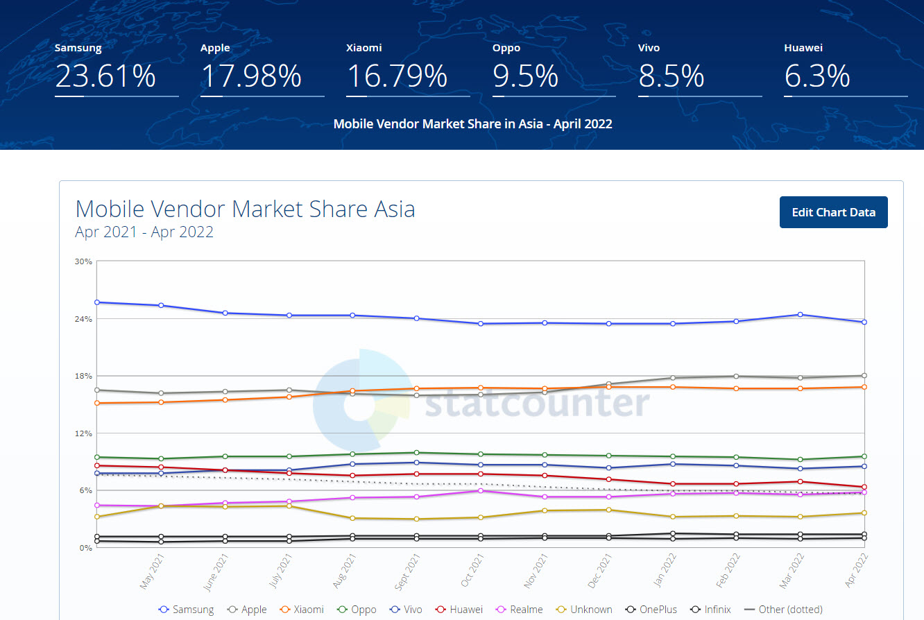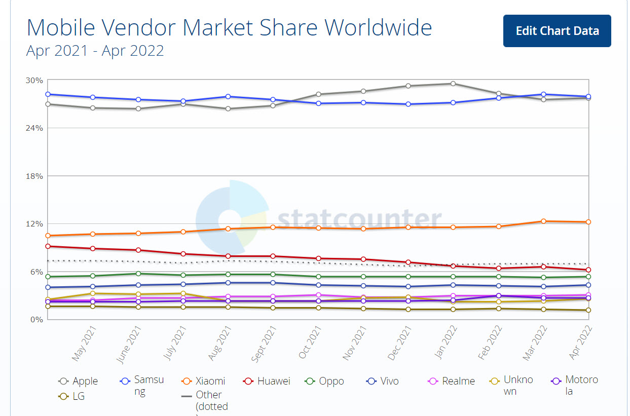 3)전세계 모바일 시장 점유율을 확인할수있다(삼성, 애플, 샤오미, 화웨이, 기타)