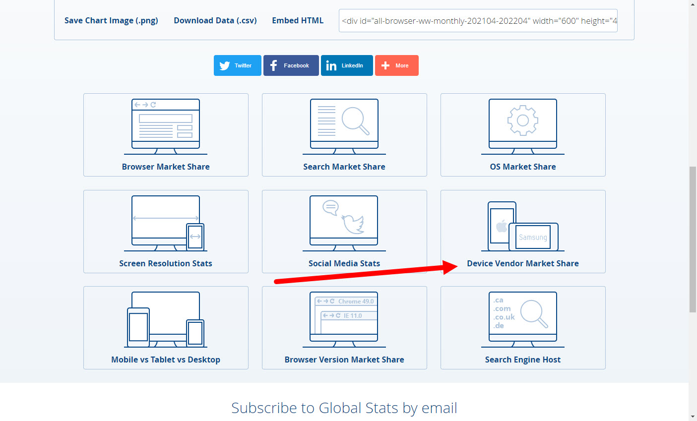 2)시장 점유율을 확인하고자하는 대상을 선택한다. 예에서 모바일(device vendor market share)을 선택하였다.