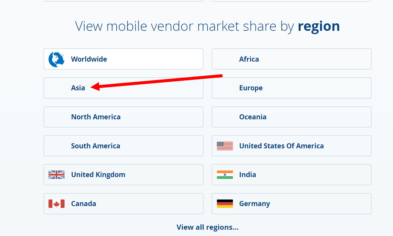 5)지역에 따른 모바일 시장 점유율을 확인할수있다. 예에서 아시아 지역을 선택하였다.