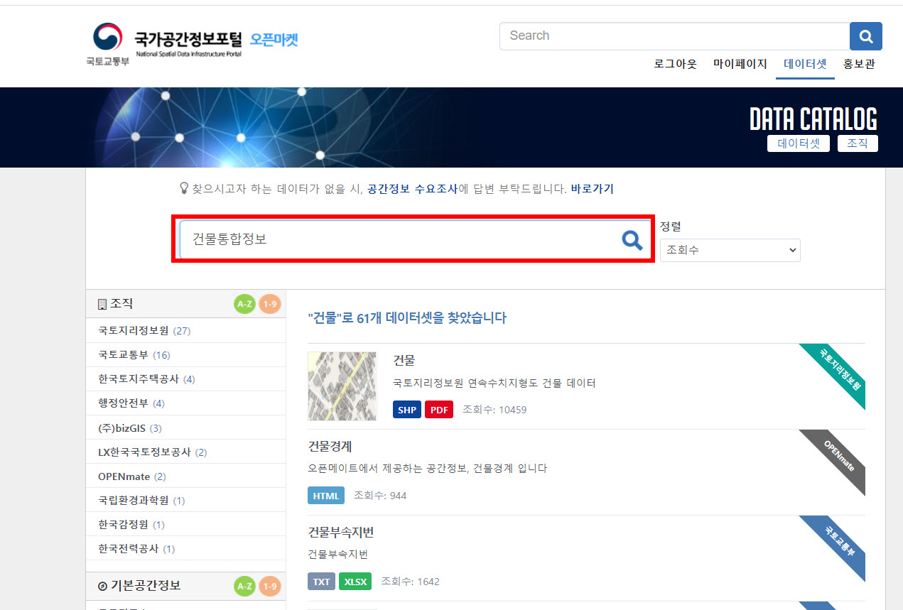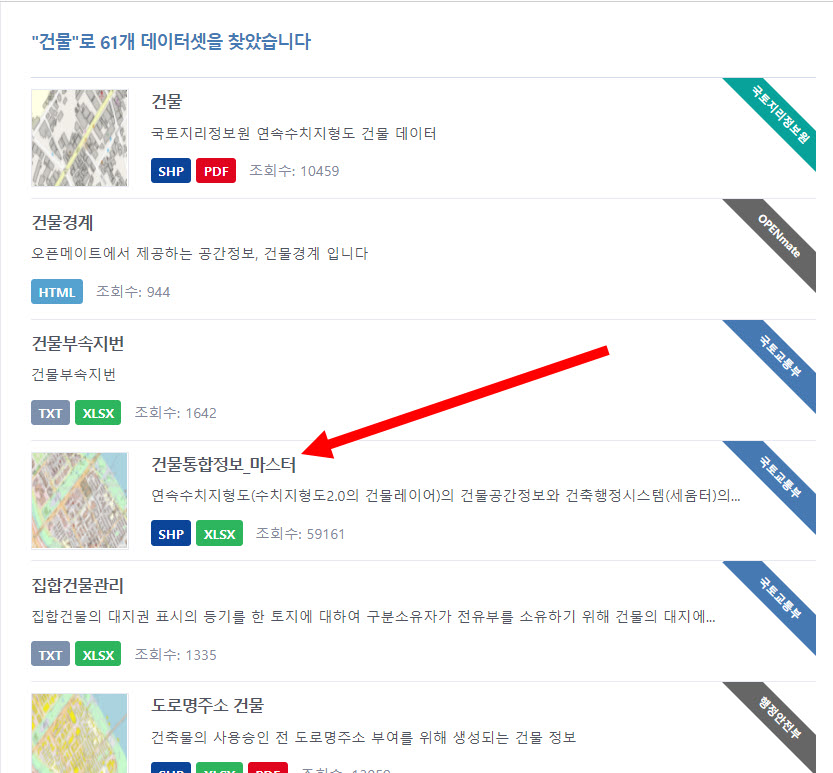 2)데이터셋 검색에서 '건물통합정보'를 입력한다.