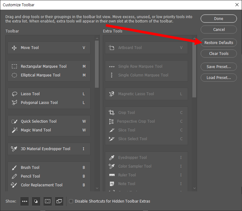 포토샵(photoshop)에서 도구 모음(tool bar)이 정상적으로 표시되지않는 경우