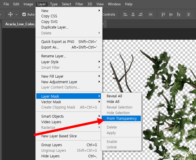 3)레이어를 선택하고 상단의 layer 메뉴에서 layer mask의 from transparency를 선택합니다.