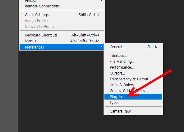 2)포토샵을 실행하고 상단의 edit 메뉴에서 preferences의 plug-ins로 이동합니다.