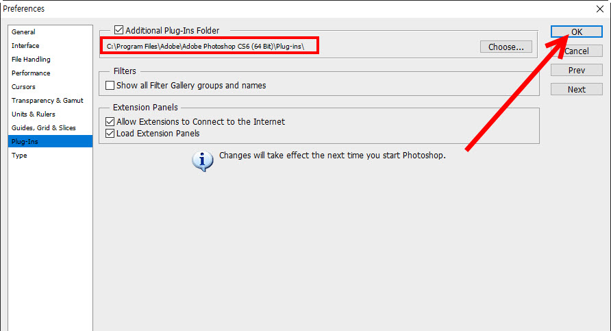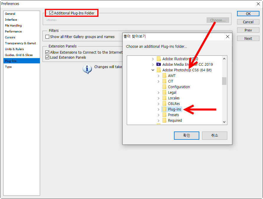 3)additional plug-ins folder에 체크하고 플러그인 폴더를 설정합니다(포토샵 버전의 plugs-ins 폴더를 선택)