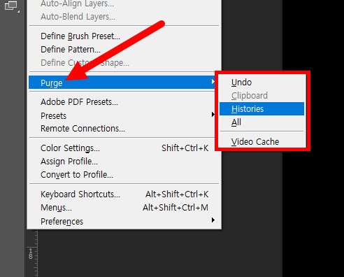 포토샵(photoshop)에서 purge를 사용하여 히스토리(undo, histories, clipboard) 제거하기