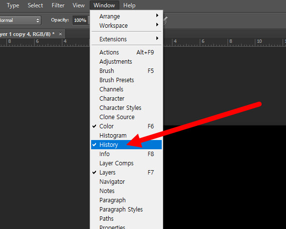 1)상단의 window 메뉴에서 history로 이동합니다.