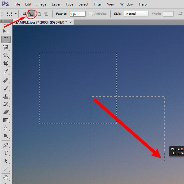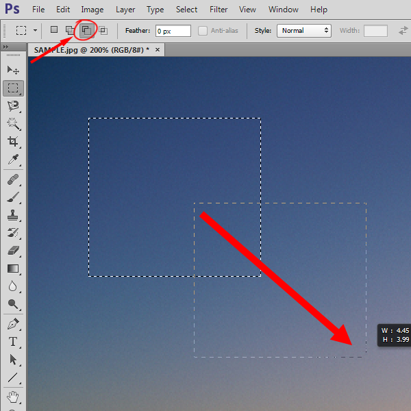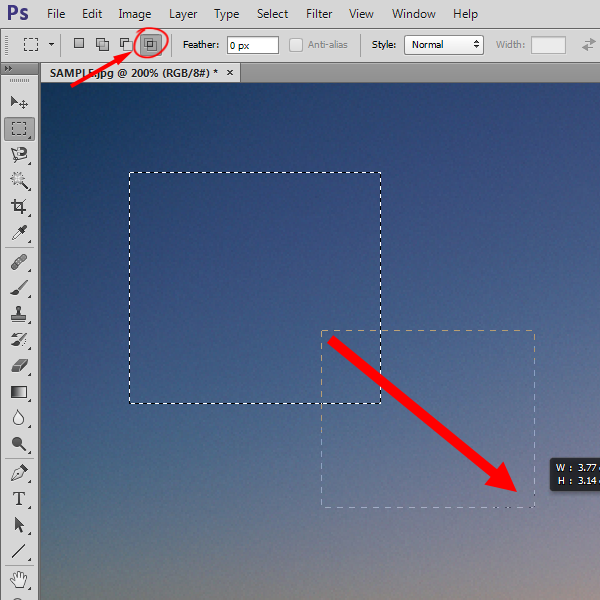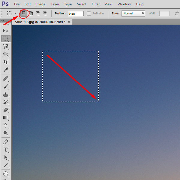 3)상단 메뉴 하단에서 Marquee Tool의 옵션들을 확인할수있습니다. New Selection를 활성화하고 클릭, 드래그하면 항상 새로운 영역을 선택합니다(단축키 shift를 사용하면 정사각형 영역을 선택하고 단축키 alt를 사용하면 클릭지점을 중심으로 하는 영역을 선택합니다)