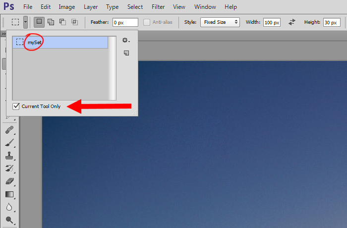 12)저장한 툴 프리셋을 확인할수있습니다. Current tool only에 체크하면 현재 선택한 툴(Marquee Tool)의 프리셋만 표시합니다.