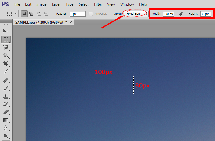 9)Style옵션에서 Fixed Size를 선택하고 width, height 픽셀 수치를 입력합니다. 이미지에 클릭하면 사용자가 지정한 크기의 영역을 선택합니다.