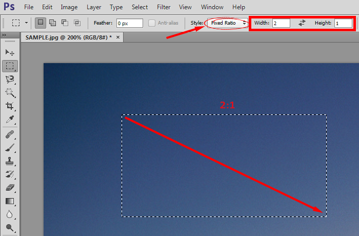 8)Style옵션에서 Fixed Ratio를 선택하고 width, height의 수치를 입력합니다. 영역을 선택하면 사용자가 지정한 가로, 세로의 길이 비율을 유지히면서 영역을 선택합니다.