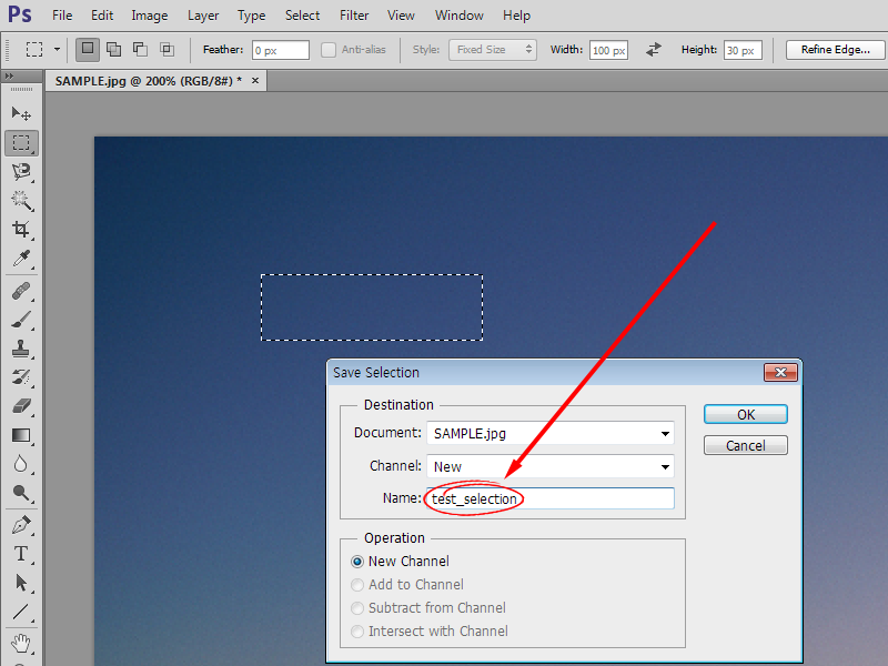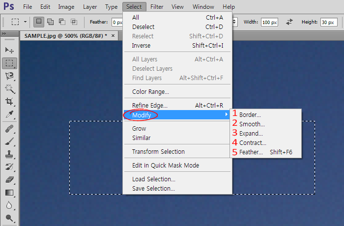 4)Modify에서 선택영역을 수정하는 몇가지 방법을 확인할수있습니다(border, smooth, expand, contract, feather)