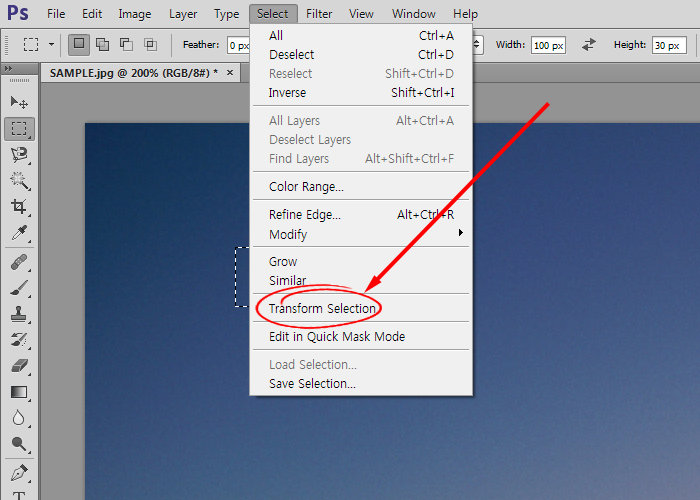 11)상단의 Select 메뉴에서 Transform Selection을 선택합니다.