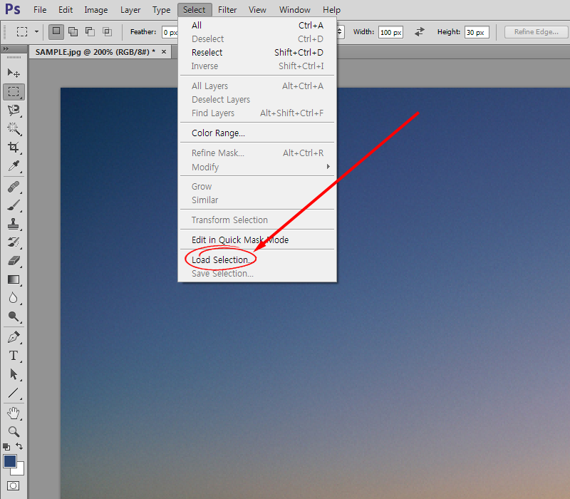 8)선택영역을 선택해제하고 상단의 Select 메뉴에서 Load Selection을 선택합니다.