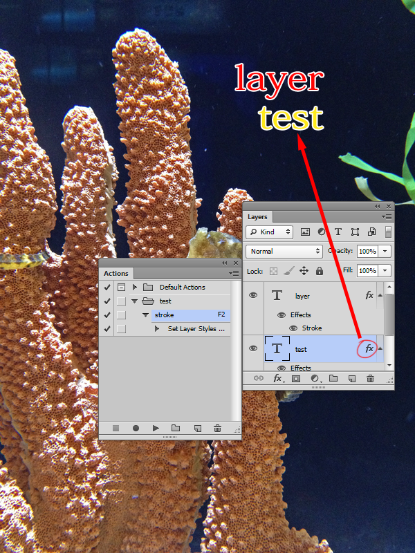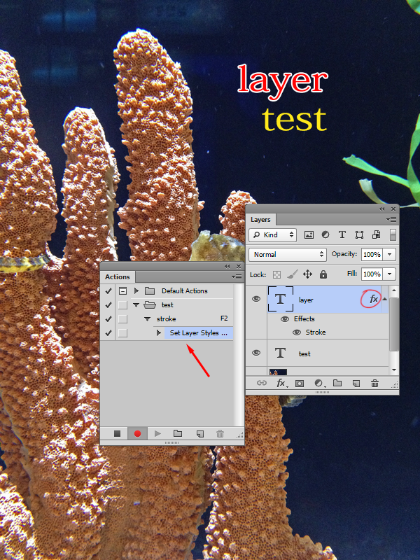11)레이어에 스트로크 이펙트가 추가된것을 확인할수있습니다. 액션 패널에서 실행한 명령이 기록된것을 확인할수있습니다.