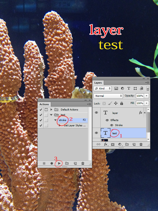 13)레이어를 선택하고 액션을 실행합니다. 액션 패널에서 실행할 액션을 선택하고 하단에서 play selection을 클릭합니다. 또는 지정한 단축키를 입력합니다.