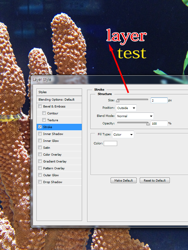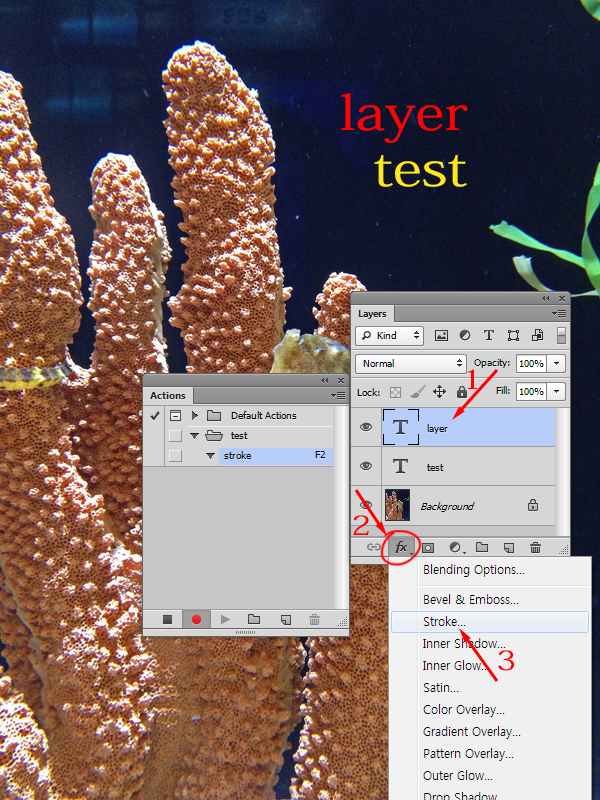 9)예를들어 오브젝트에 스트로크를 생성하는 명령을 실행합니다. 레이어를 선택하고 하단에 표시한 아이콘 add a layer style을 클릭하고 Stroke를 선택합니다.