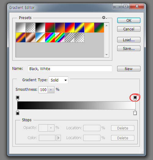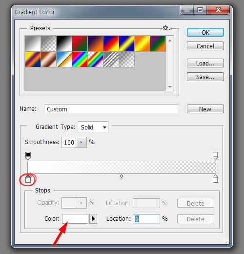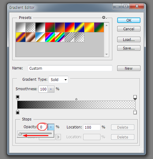 10)graidient editor에서 우측에 표시한 opacity stop을 선택합니다.