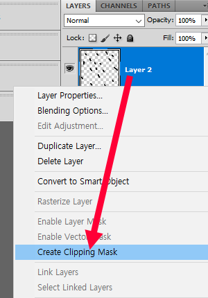 2)상위 레이어를 선택하고 마우스 우클릭한후 create clipping mask를 선택합니다.
