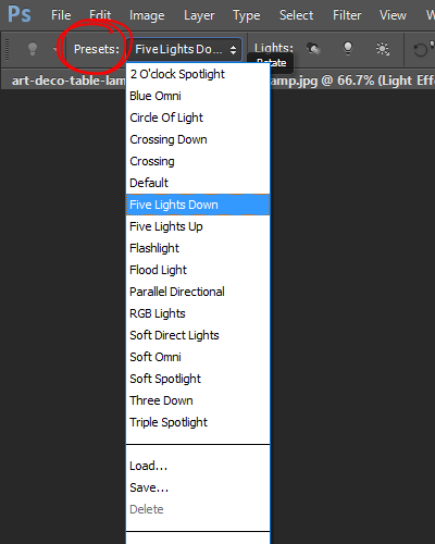 6)좌측의 presets에서 조명 효과 프리셋을 사용할수있습니다. five lights down를 선택합니다.