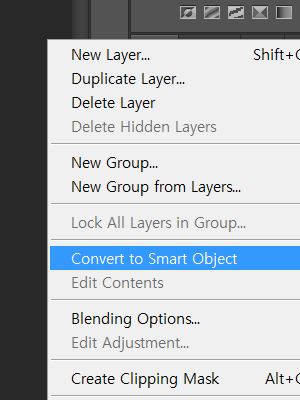 1)조명 효과(lighting effects) 필터를 적용할 이미지 레이어를 스마트 오브젝트(smart object)로 변환합니다. 레이어를 선택하고 마우스 우클릭한후 convert to smart object를 선택합니다.
