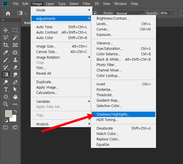 2)상단의 image 메뉴에서 adjustments의 shadows/highlights로 이동합니다.