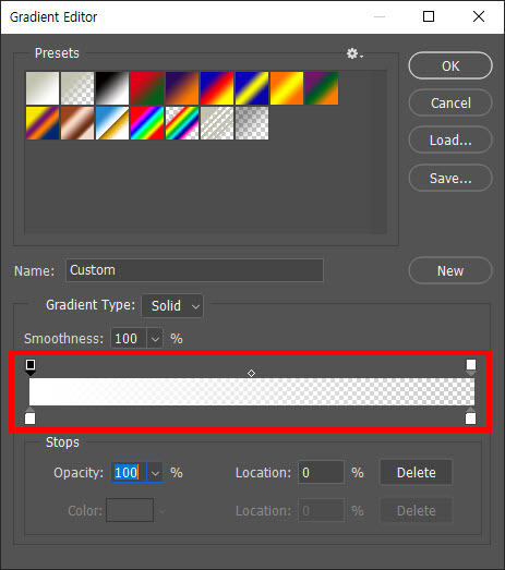8)좌에서 우로 투명해지는 흰색 그라데이션을 설정합니다.