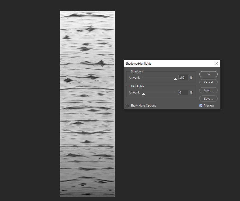 3)shadows 및 highlights의 amount를 조절하여 음영을 제거합니다.