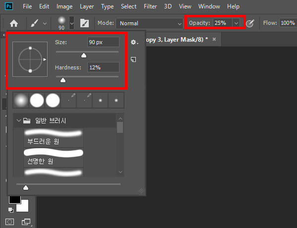 7)브러시의 hardness와 opacity를 설정합니다.