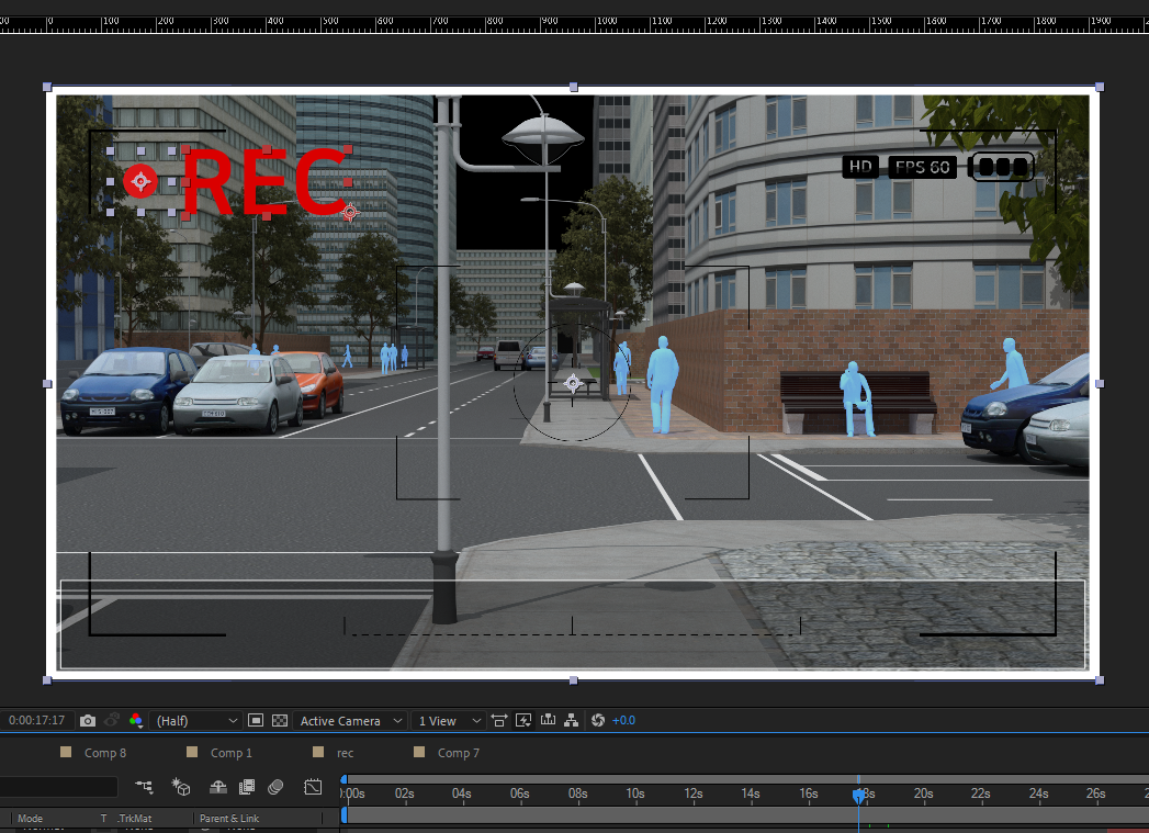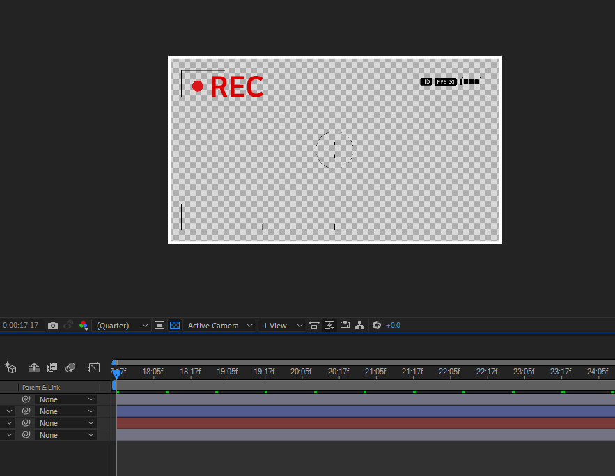 1)예에서 컴포지션에는 배경을 구성하는 다수의 레이어와 배경 이미지 위에 존재하는 뷰파인더 인터페이스를 구성하는 다수의 레이어가 있습니다.