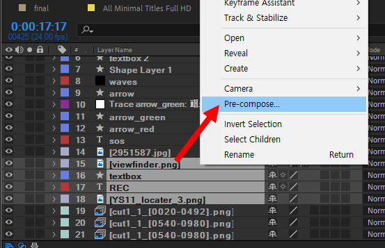 3)마우스 우클릭하고 pre-compose를 선택합니다.
