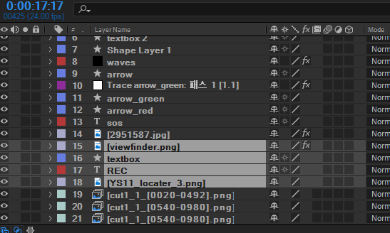 6)새로운 컴포지션으로 이동하면 사전 구성한 레이어들을 확인할수있습니다.