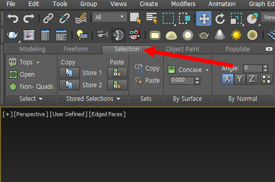 4)오브젝트에 존재하는 모든 오각형을 선택하기위해 리본 인터페이스에서 selection으로 이동합니다.