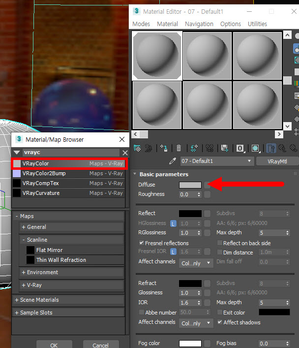 2)재질의 디퓨즈(diffuse) 맵에 VRayColor 맵을 추가합니다.