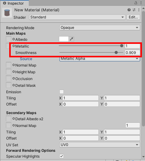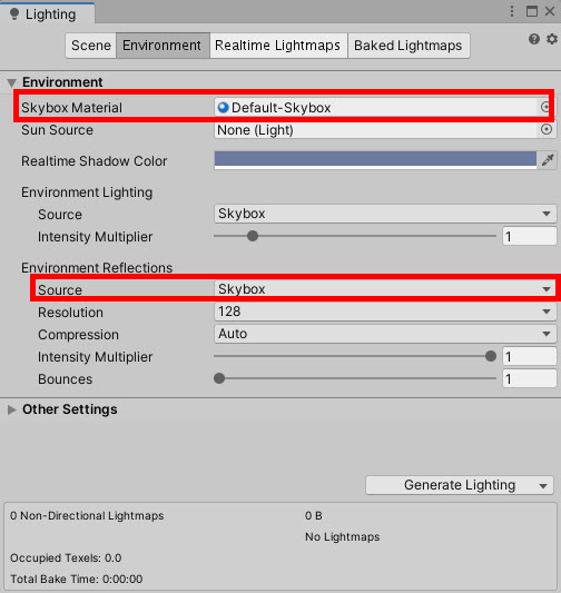 5)라이팅의 환경(lighting window, environment)에서 환경 반사(environment reflections) 소스(source)가 기본 스카이박스 재질(default-skybox)을 사용하는 스카이박스(skybox)로 설정되어있는것을 확인할수있습니다.