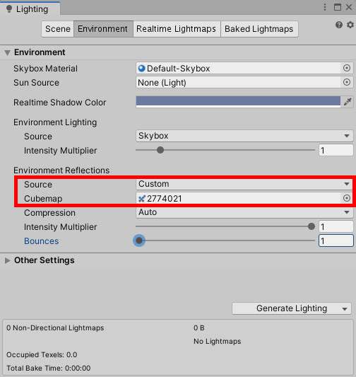 8)환경 반사(environment reflections)의 source에서 custom을 선택하고 cubemap에 큐브맵을 설정합니다.