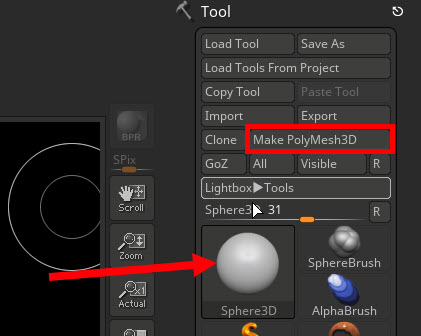 1)지브러시에서 스피어(sphere3D)의 PolyMesh3D 오브젝트를 생성합니다.