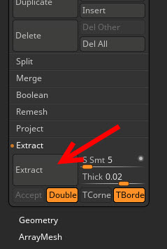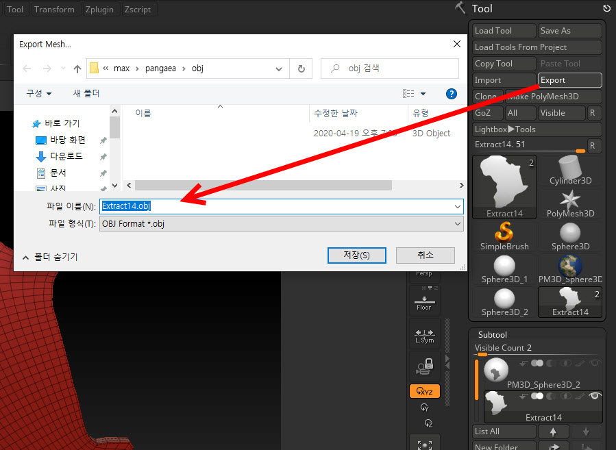 6)subtool에서 extract를 사용하여 마스킹 영역을 돌출시켜 새로운 오브젝트를 생성합니다.