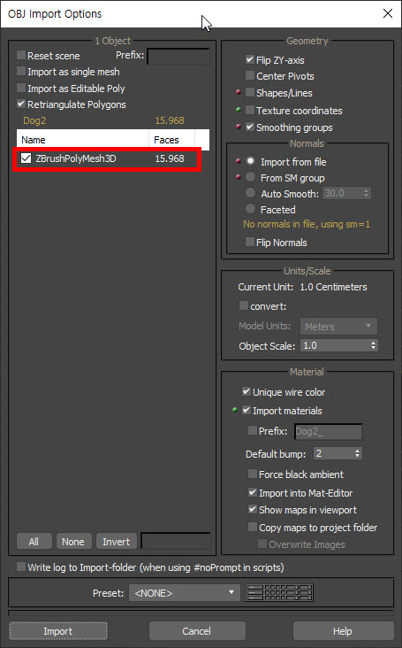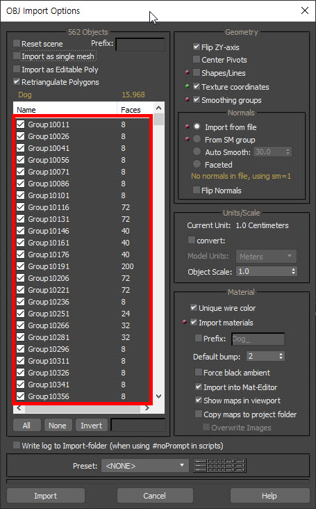 지브러시에서 내보내기한 obj파일을 3D맥스에서 다수의 그룹 메시로 가져오기하는 경우