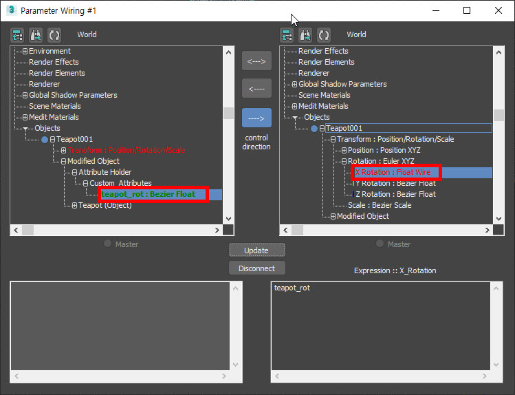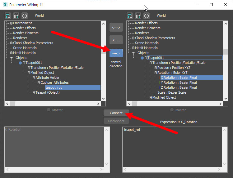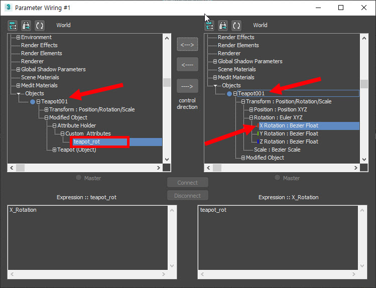 3)컨트롤 방향(control direction)을 선택하고 connect를 클릭합니다. 예에서 teapot001의 teapot_rot 속성을 설정하여 teapot001 오브젝트의 x회전을 컨트롤합니다.