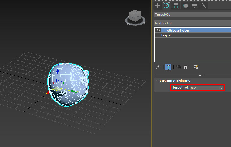 5)teapot001 오브젝트의 사용자 정의 속성에서 teapot_rot 수치를 설정하면 teapot001 오브젝트가 x축 회전합니다.