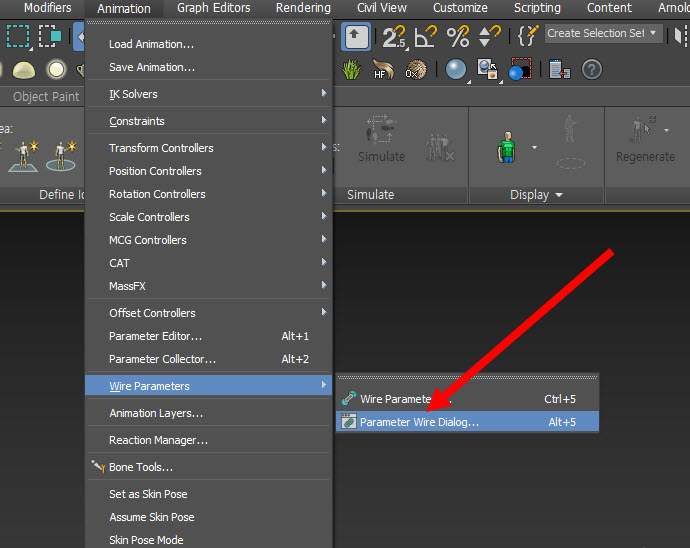 1)상단의 animation 메뉴에서 wire parameters의 parameter wire dialog로 이동합니다.