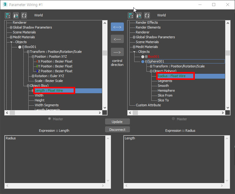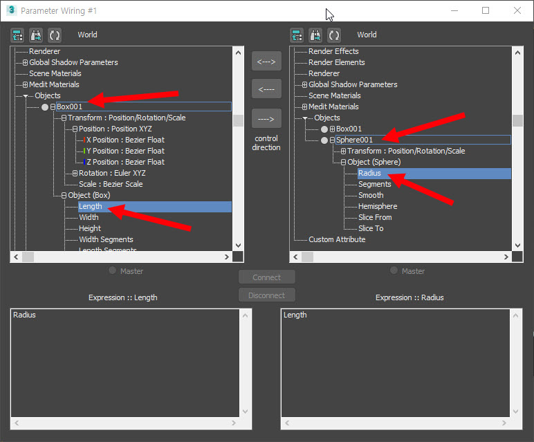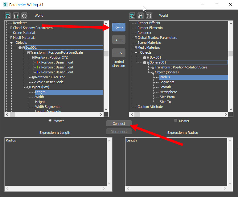 3)연결할 두개의 오브젝트의 파라미터를 선택합니다. 예에서 box 오브젝트의 length 파라미터와 sphere 오브젝트의 radius 파라미터를 선택하였습니다.
