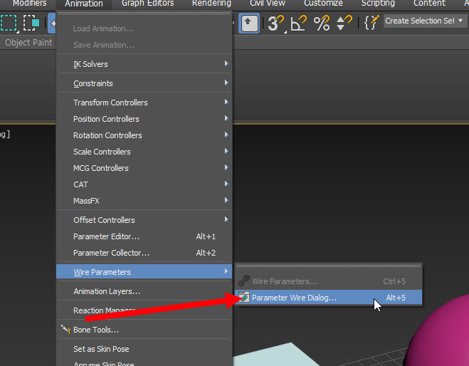 2)상단의 animation 메뉴에서 wire parameters의 parameter wire dialog로 이동합니다.