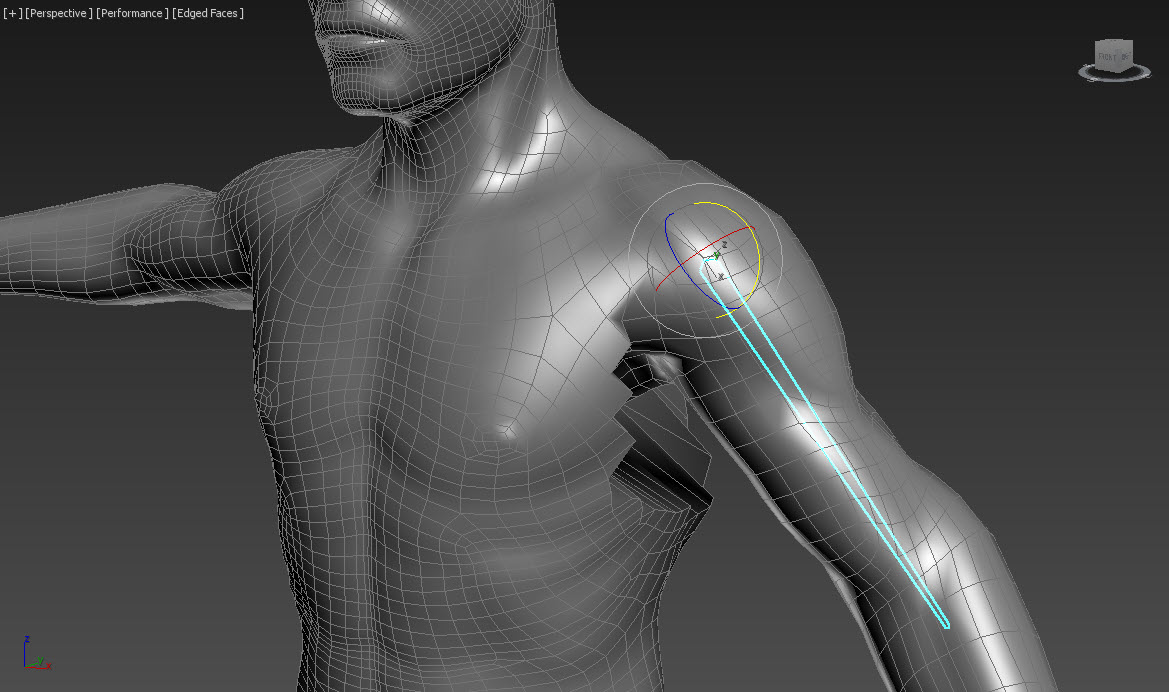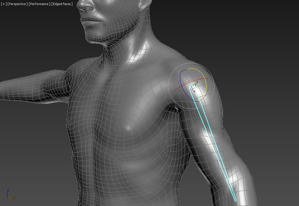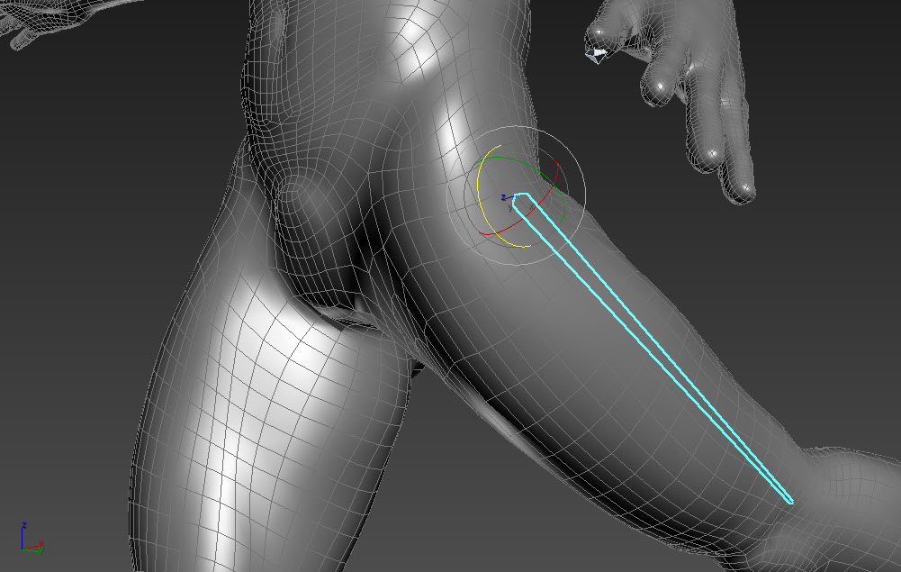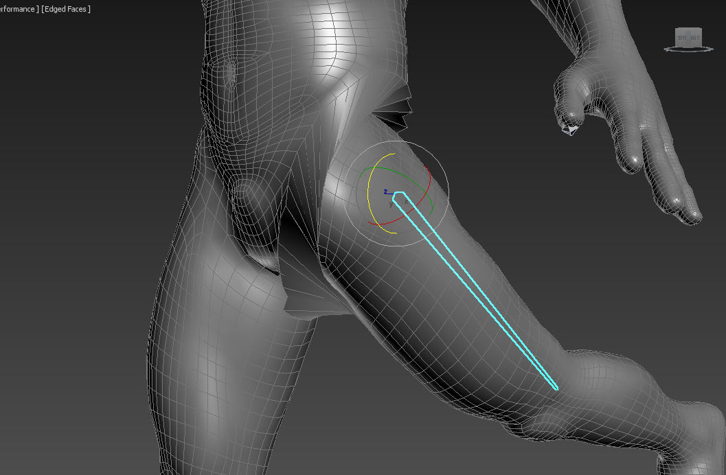 4)본 오브젝트를 변형하면(이동, 회전) 캐릭터 모델 또한 정상적으로 변형됩니다. 하지만 스킨의 추가적인 weight 할당 작업이 필요한것을 확인할수있습니다.