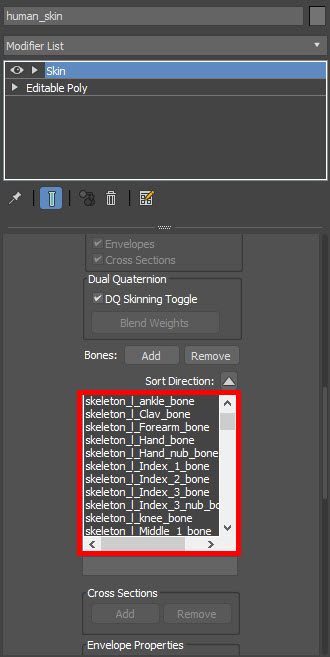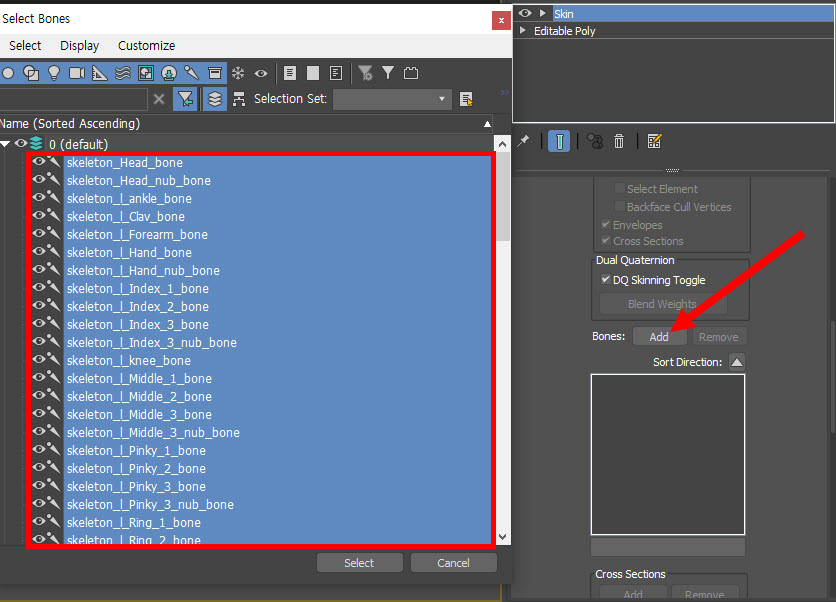 3)skin 수정자의 parameter에서 bones의 add를 클릭하여 본(bones)을 추가합니다.