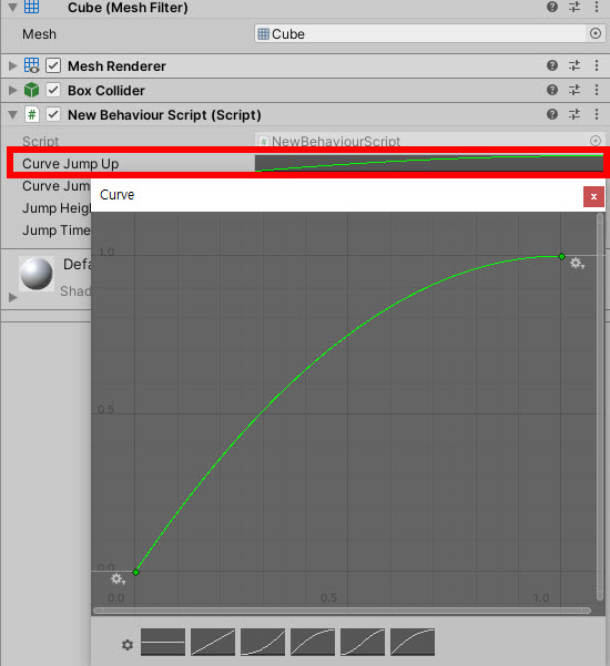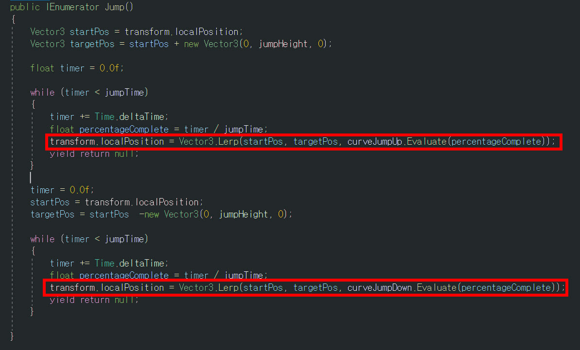 1)두개의 애니메이션 커브(AnimationCurve) 유형 변수를 선언합니다(뛰어오르는 동작, 낙하하는 동작)