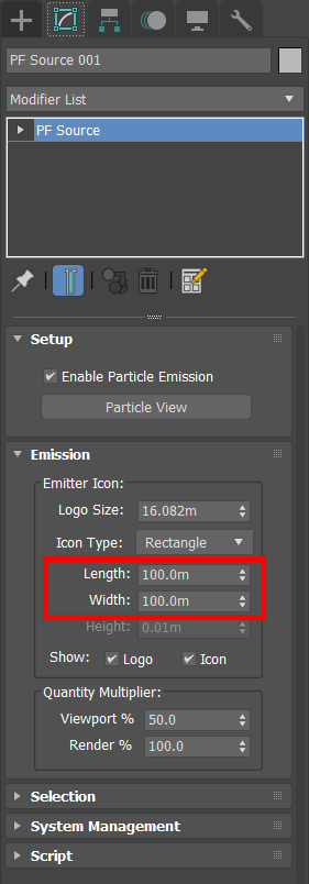 8)PF Source 오브젝트의 emission에서 방사체의 크기를 설정합니다. PF Source 오브젝트를 회전시켜서 방사체에서 파티클이 방출되는 방향을 설정합니다.