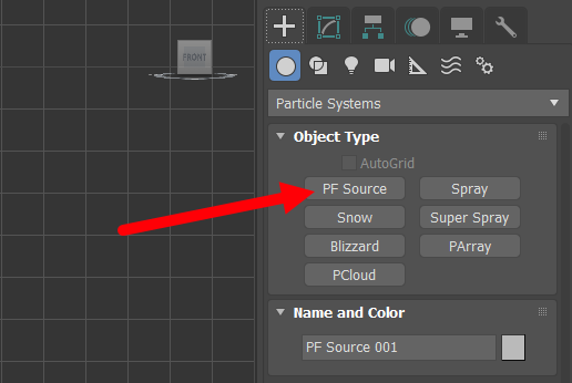 4)PF Source 오브젝트 유형을 선택하고 뷰포트에서 클릭, 드래그하면 새로운 Particle Flow Source를 생성합니다.