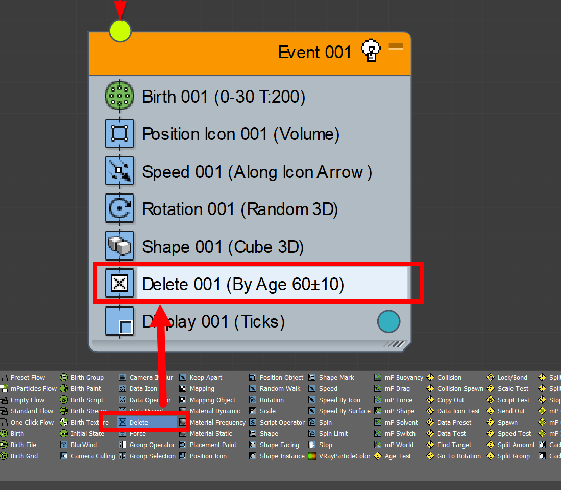 4)파티클의 수명을 설정하려면 이벤트에 delete 연산자를 추가합니다. 하단의 delete 연산자를 클릭, 드래그하여 연산자 목록에 추가합니다.