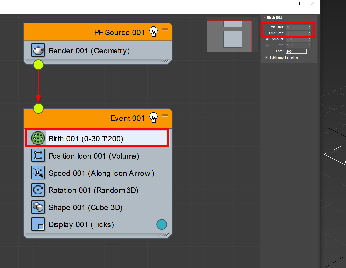 1)birth 이벤트에서 파티클의 생성 기간이 기본값(프레임에서 30프레임까지)으로 설정되어있는것을 확인할수있습니다.